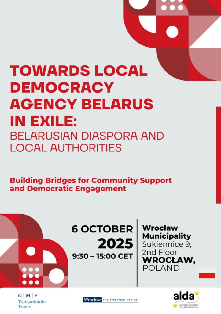 6 кастрычніка 2025 года ў мэрыі Уроцлава адбудзецца сустрэча пад назвай «Беларуская дыяспара і мясцовыя ўлады — будуем масты для супольнай падтрымкі і дэмакратычнага ўдзелу». Падзея пройдзе з 09:30 да 15:00. Мерапрыемства арганізуецца ALDA — Еўрапейскай асацыяцыяй мясцовай дэмакратыі сумесна з мэрыяй Уроцлава пры падтрымцы GMF. Мэта сустрэчы — вызначыць асноўныя патрэбы беларусаў у сацыяльнай,…